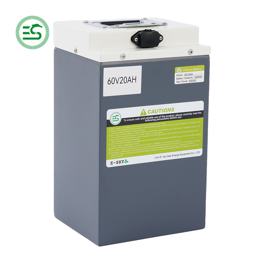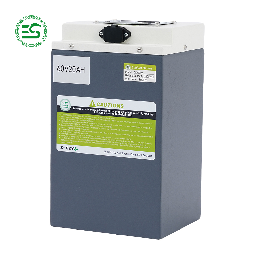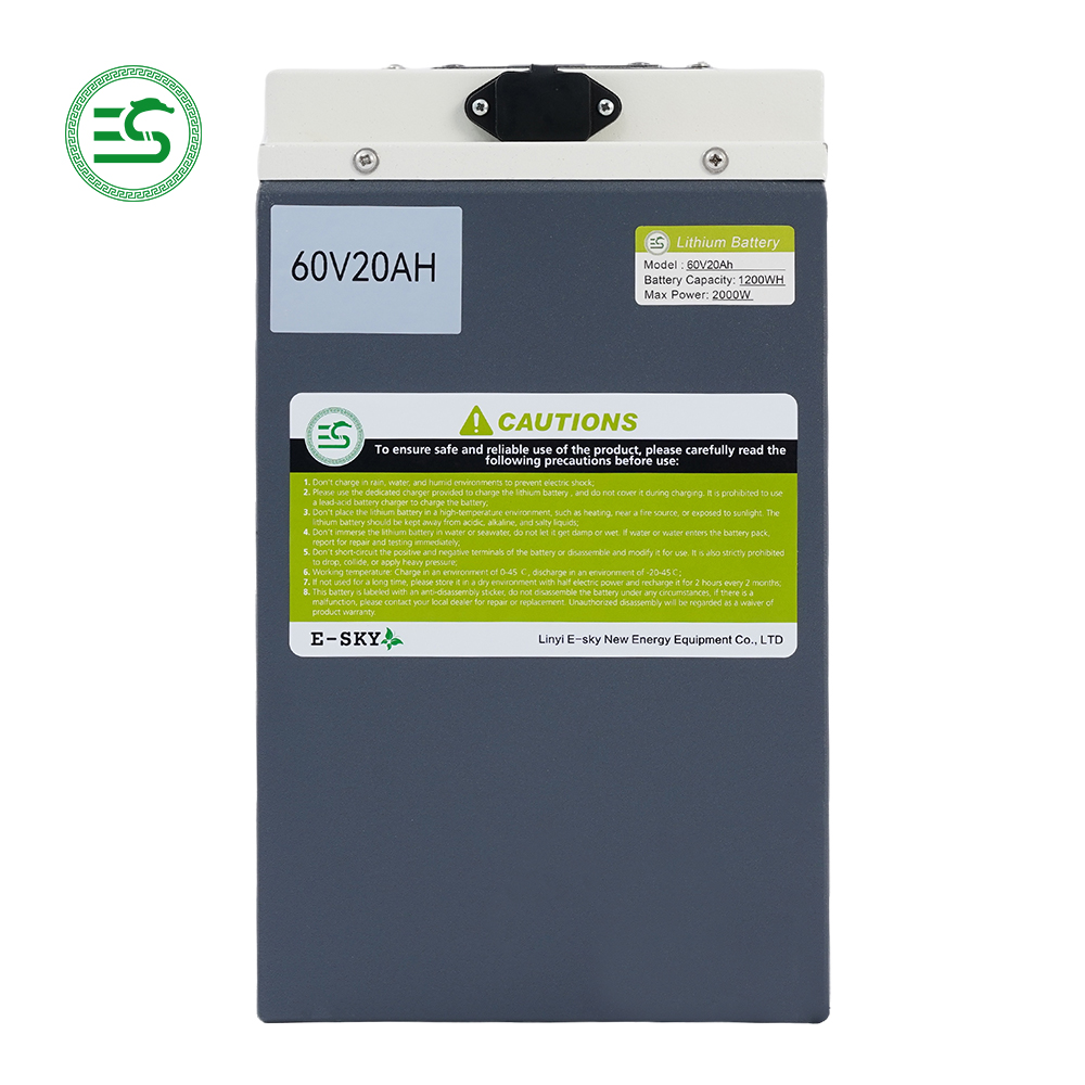 Our 60V20Ah lithium battery is a high-performance power solution engineered exclusively for electric vehicles, including e-bikes, e-scooters, and electric tricycles. Manufactured by Linyi E-sky New Energy Equipment Co., Ltd., this 1200WH lithium battery for electric bikes delivers a max power of 2000W, perfectly matching 500W/800W/1000W brushless motors for high efficiency and low energy consumption. Designed with users in mind, it replaces traditional lead-acid batteries with superior durability, portability, and cycle life, making it the top choice for electric vehicle manufacturers, distributors, and wholesale suppliers worldwide. The 60V lithium battery for electric scooters features a steel shell, ergonomic built-in handle, and horizontal charging jack to prevent water retention, ensuring reliable performance in all working conditions.